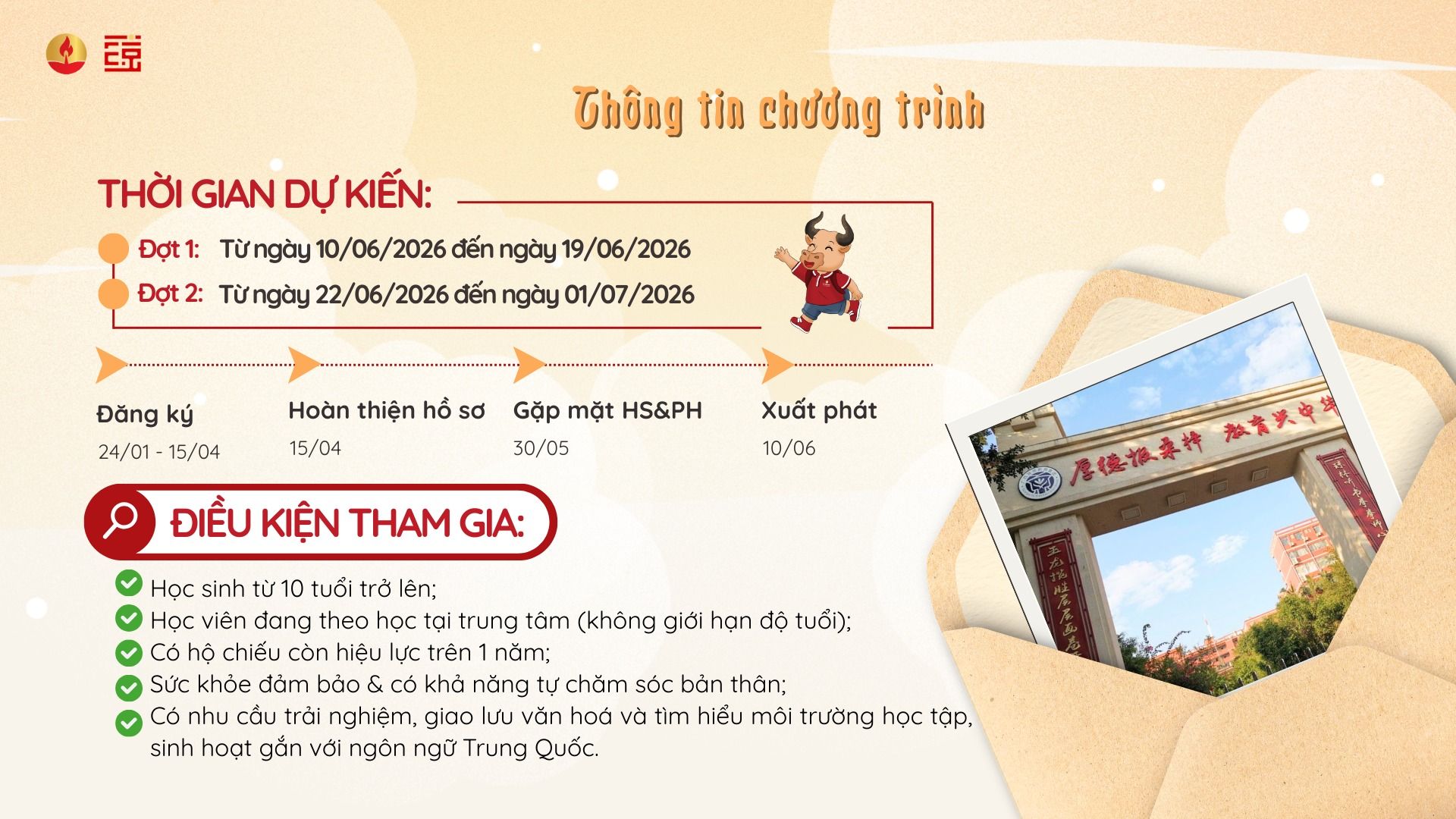 💫Mở rộng góc nhìn văn hoá và định hướng tương lai học tập quốc tếĐây không chỉ là một chuyến đi mùa hè, mà là một tháng sống như một học sinh Trung Quốc, học – sinh hoạt – kết nối trong môi trường nội trú an toàn, có giáo viên và đội ngũ quản lý đồng hành 24/7.